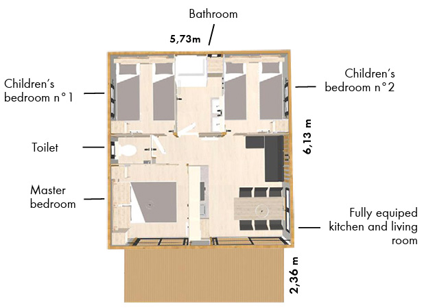 | pour 6 personnes | 33 m2 (6x5,5 m) | Terrasse couverte |